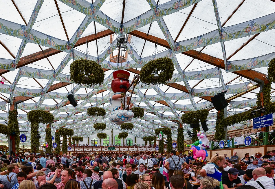 慕尼黑啤酒節的會場超大,設置眾多遊樂設施,不過最顯眼的還是14個大帳篷(其實是臨時搭建的建物)