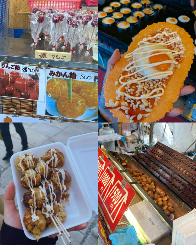 日本屋台美食 第一次去日本跨年!1/1一早前往🇯🇵大阪四天王寺參拜~有幸逛到日本的路邊攤 🔅蘋果糖 🔅章魚燒 🔅雞蛋仙貝 🔅雞蛋糕 很特別的是每一家路邊攤都不重複,完全不會怕彼此搶到生意! 蘋果糖、橘子糖超級酷 外層的麥芽糖 吃起來好幸福!印象最深刻的是雞蛋仙貝 雞蛋煎的又圓又好看 淋上甜甜的醬汁+米果+美乃滋,一個人就可以嗑掉一個,超級滿足😌 如果有到日本玩~絕對不要錯過逛「屋台」的好機會呢!各種美食等你來享用😍