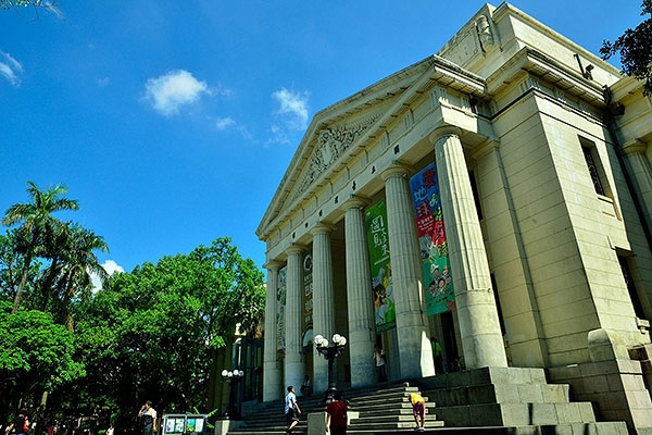 這位於臺北火車站前的博物館,外觀為希臘式建築,有巨大柱子和花葉紋飾的牆、羅馬圓頂,柱頭上有精緻的裝飾,圓頂下是一面彩繪玻璃天窗,陽光穿過玻璃,在地面映出美麗的光彩。