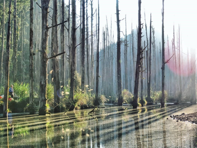 讓原本生長在原地的杉林因長期泡水導致枯死,枯樹倒映在水中呈現的凋零之美