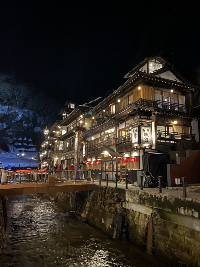 銀山溫泉保留濃厚大正時代風情,夜晚燈光與雪景交織,宛如童話世界