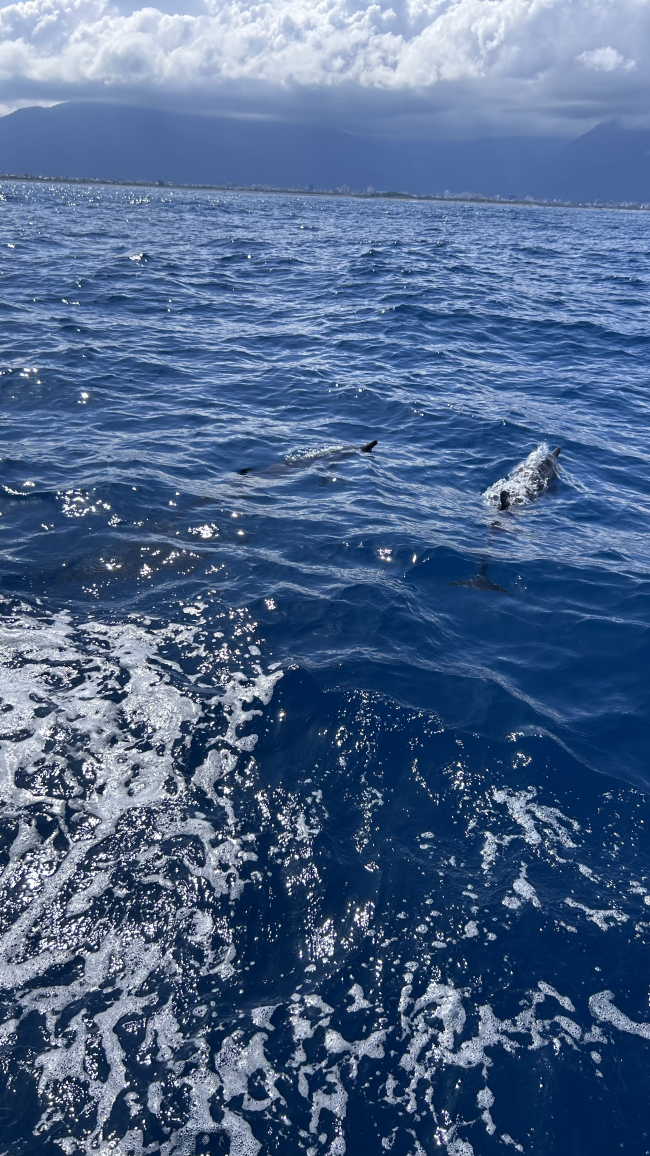 牠們成群結隊地跳躍、穿梭在浪間,有些甚至靠近船邊與我們並行, 那畫面太夢幻,像是電影裡才會有的場景。