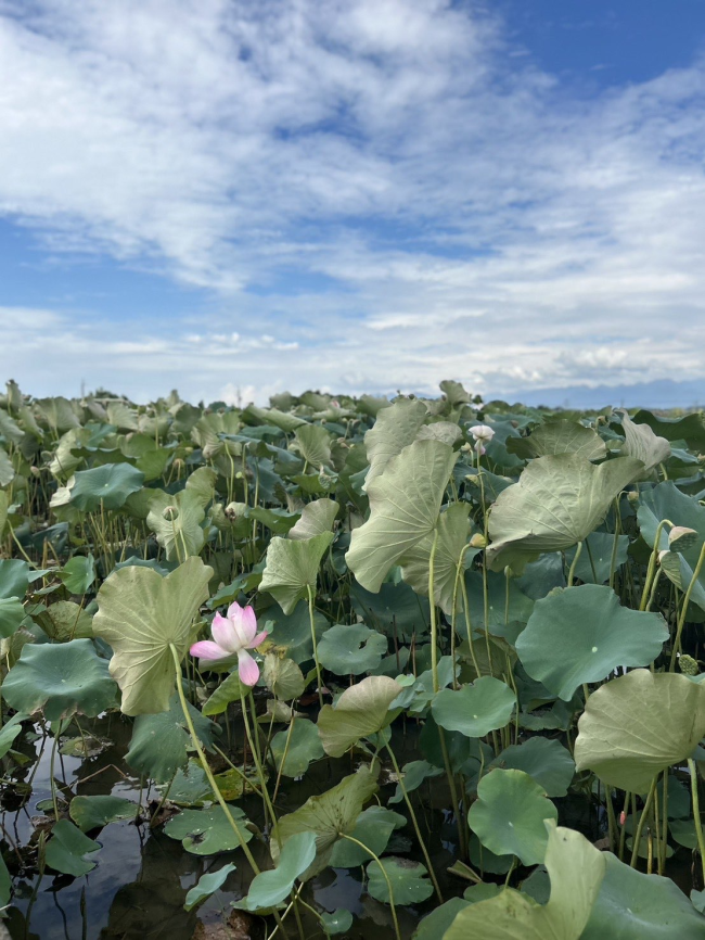 此時花呈現三分之二開 姿態最美 我們去的時候 下午時段 蓮花花苞沒有綻放 但當風輕拂而過 蓮葉、蓮藕與蓮花隨之擺盪 與池畔相映既優雅又清幽