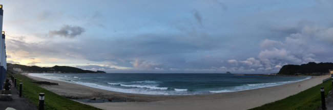 照片中,夕陽餘暉灑落在海平面左側,天色漸漸由金黃轉為柔藍,與寬闊的海岸線完美融合,雲層層疊堆疊,有著宛如油畫的層次感。