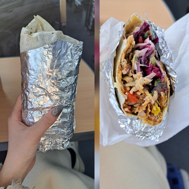 döner 這是在德國各個城市街上還常看到的小吃,是土耳其沙威瑪,德文是döner,裡面有肉有各種蔬菜,營養均衡,而且吃得滿有飽足感的,有雞肉和牛肉口味,在德國物價偏高的情況下,一份只要7~9歐,不到10歐就可以解決一餐,還可以體驗當地美食,cp值高