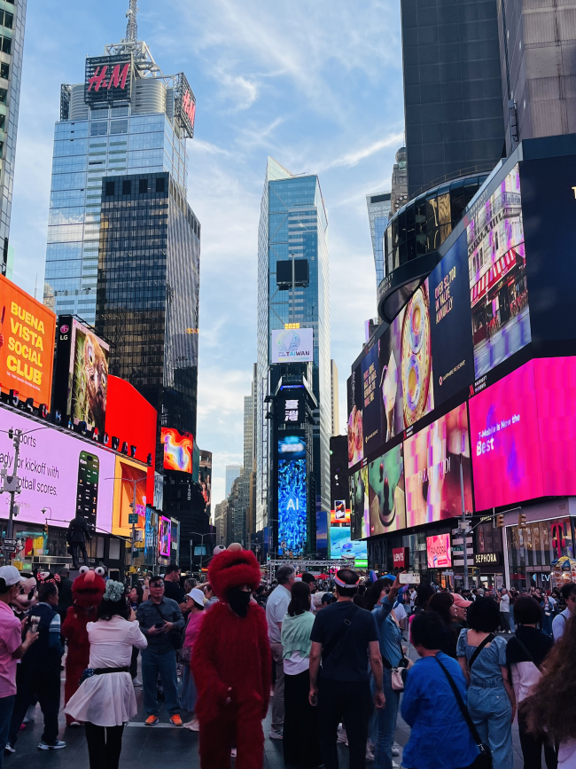 這張照片拍攝於紐約的時代廣場(Times Square)——那個永遠閃爍著燈光、擁擠卻充滿能量的地方。 巨大的電子看板輪番閃爍著色彩,街頭角色穿梭在人群中,來自世界各地的旅人都在此刻停下腳步,舉起手機記錄這座城市的脈動。站在其中,能感受到一種屬於紐約的節奏——喧鬧卻迷人、混亂卻充滿夢想。 那是一種讓人想要更靠近的能量,提醒著自己:這個世界永遠比想像中更大,而夢想,也該更勇敢一點。